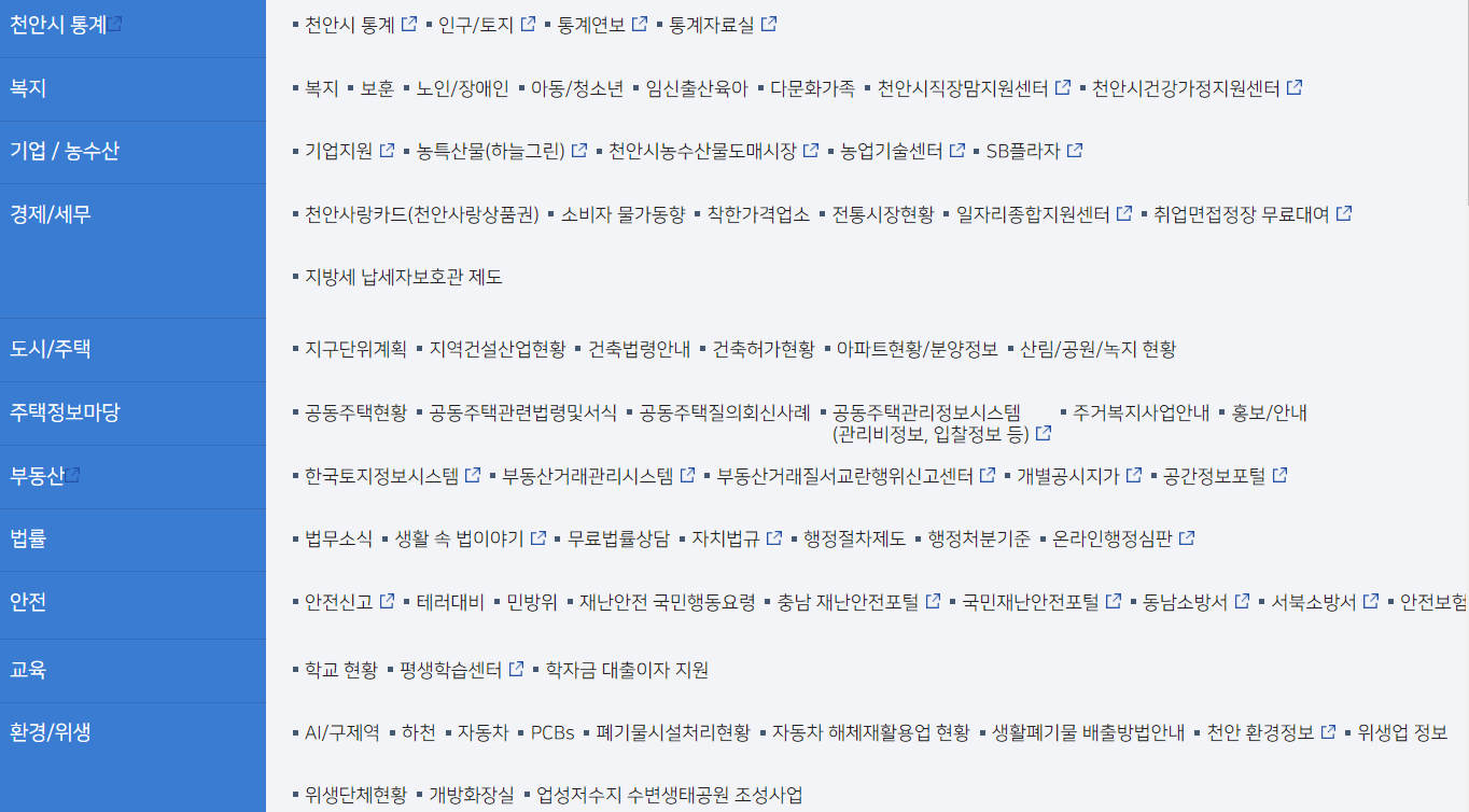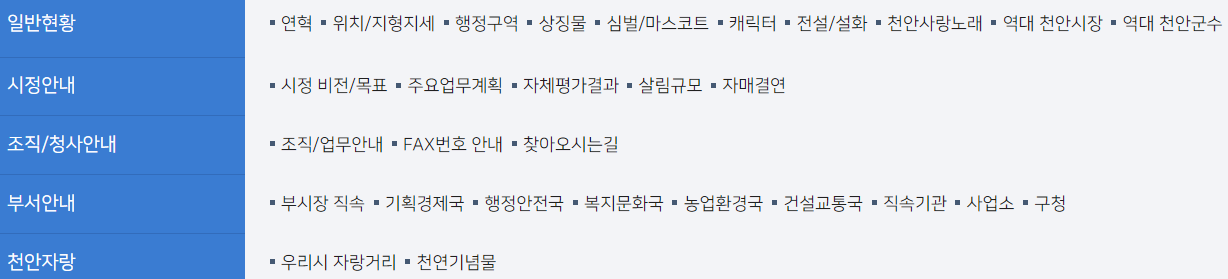 천안시청 분야별 정보 바로가기