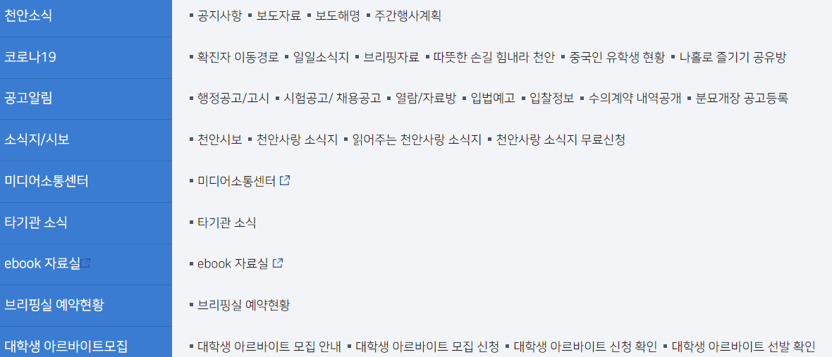 두번째 메뉴는 소식 알림입니다. 천안소식, 코로나19, 공고알림, 소식지, 시보, 타기관 소식 및 대학생 아르바이트 모집 안내 등이 있습니다. 대학생 아르바이트 안내는 정말 좋은 제도 같습니다.
