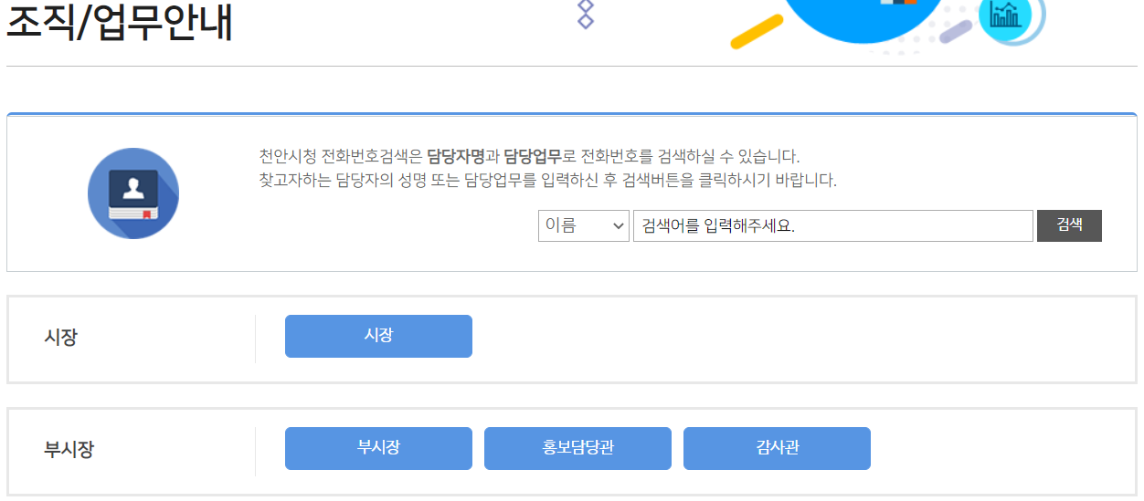 조직도를 보실 수 있으며 천안시청의 담당자명과 담당업무로 간편하게 전화번호를 검색하실 수가 있습니다.