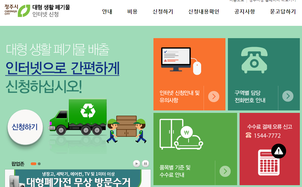 생활하다보면 쓰레기 관련으로 처리할 것이 있을 수 있어요. 청주시는 별도로 대형 생활폐기물 홈페이지를 운영하고 있어서 여기에서 신청과 비용안내 등의 모든 업무를 보실 수가 있어요.