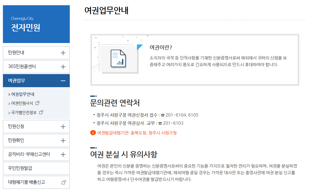 청주시 서원구청 여권신청서 접수 : ☎ 201-6104, 6105