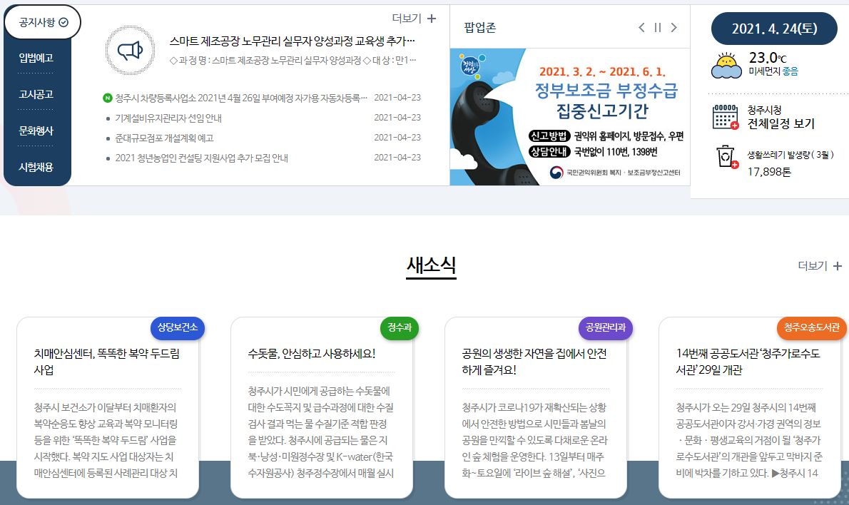 화면을 좀더 아래로 내려보면 공지사항과 새소식 같은 청주시의 다양한 소식을 한눈에 접할 수 있습니다. 편리한 방법인것 같아요. 우측에는 날씨와 청주시청 전체일정과 생활쓰레기 발생량도 보여주고 있어요.