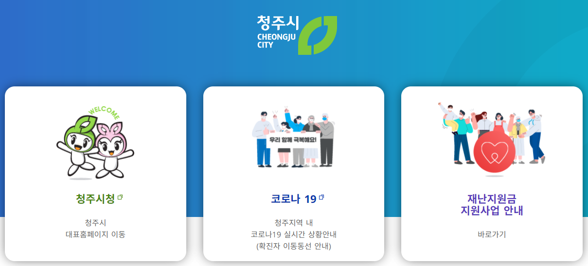 청주시청 홈페이지를 누르시면 아래와 같은 화면이 가장 먼저 나오게 됩니다. 코로나관련 때문에 이렇게 나오는데 빨리 종식이 되면 좋겠어요. 좌측에 청주시청, 중앙에 코로나정보 우측에 재난지원금 안내 링크입니다.
