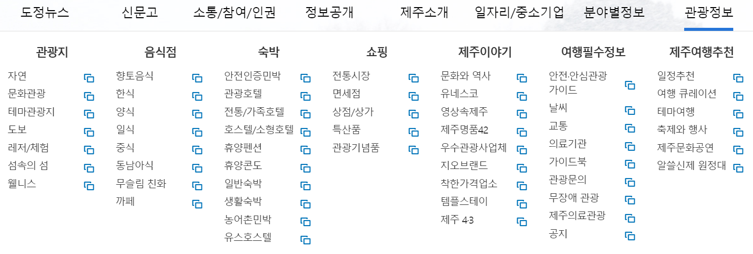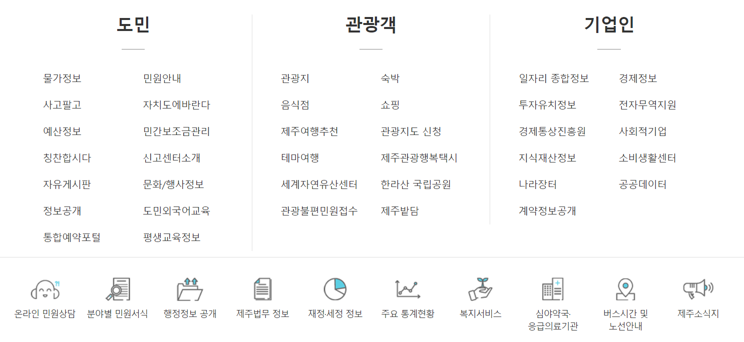맨 아래까지 화면을 내리시면 도민, 관광객, 기업인으로 분류하여 자주찾는 메뉴를 제공하고 있습니다. 찾으시는 대부분의 메뉴는 여기에 있지 않을까 싶네요.