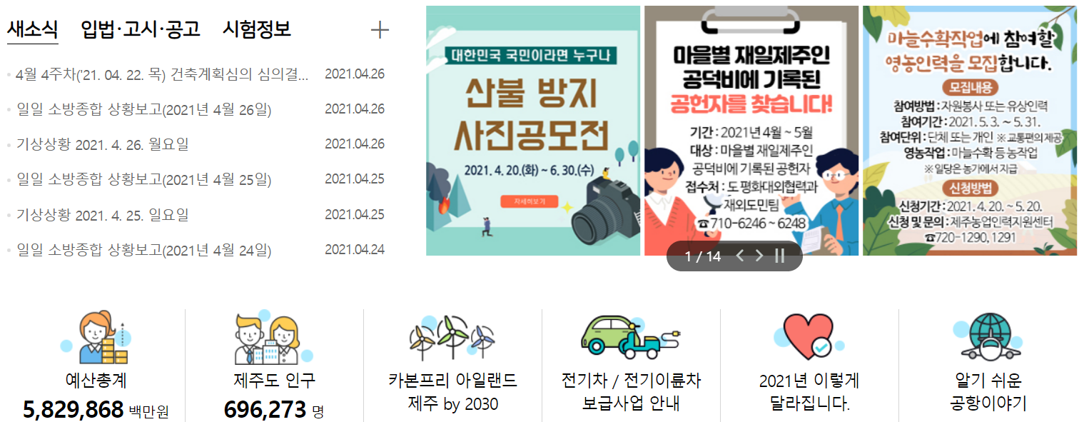 첫 화면 중앙부에는 주요 제주도 소식을 소개해 주고 있습니다. 전기차, 전기이륜차 보급사업도 확인이 가능합니다. 공항도 소개를 해 주고 있습니다.