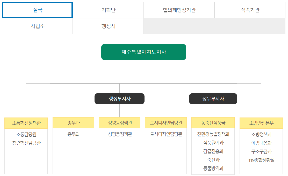 이제부턴 관광객이 아닌 제주도민을 위한 메뉴 안내입니다. 제주도청에서 업무를 보시기 위해서는 조직도를 알아두시면 아주 유용합니다. 제주도는 도지사 아래에 행정부지사, 정무부지사가 각각 있고 그 아래에 각종 부서가 있습니다.