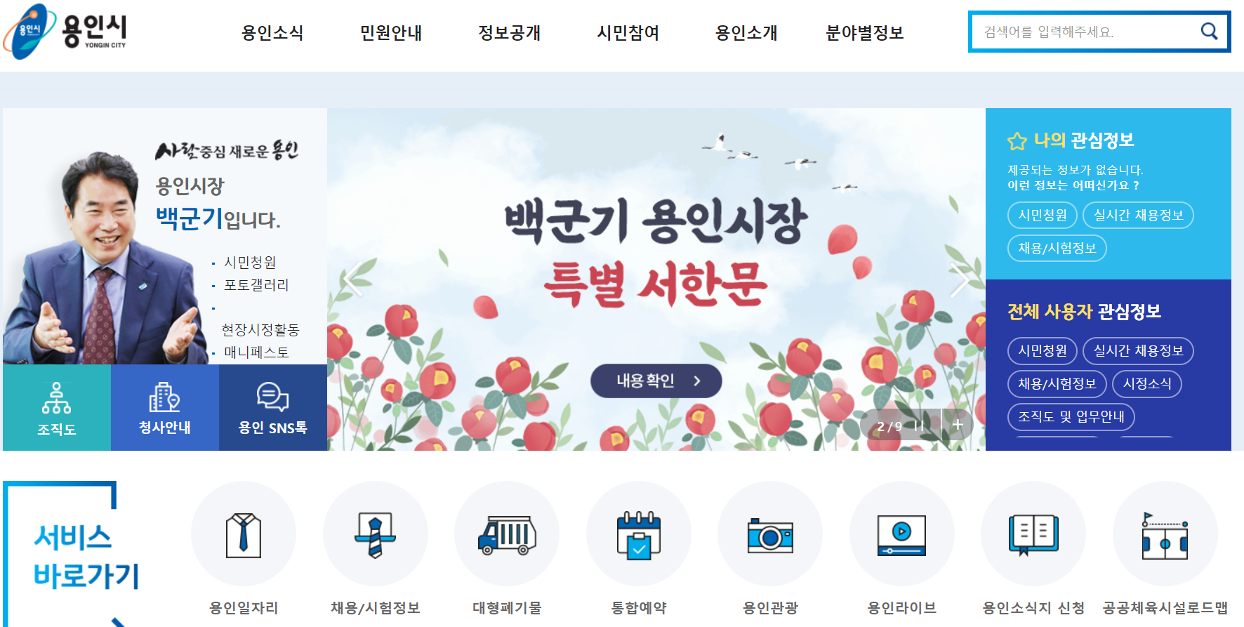 먼저 용인시청 홈페이지로 접속을 해 보겠습니다. 다들 아시다 시피 검색을 하시면 간편하게 접속이 가능하며, 아래의 링크로도 접속 하실 수가 있습니다.